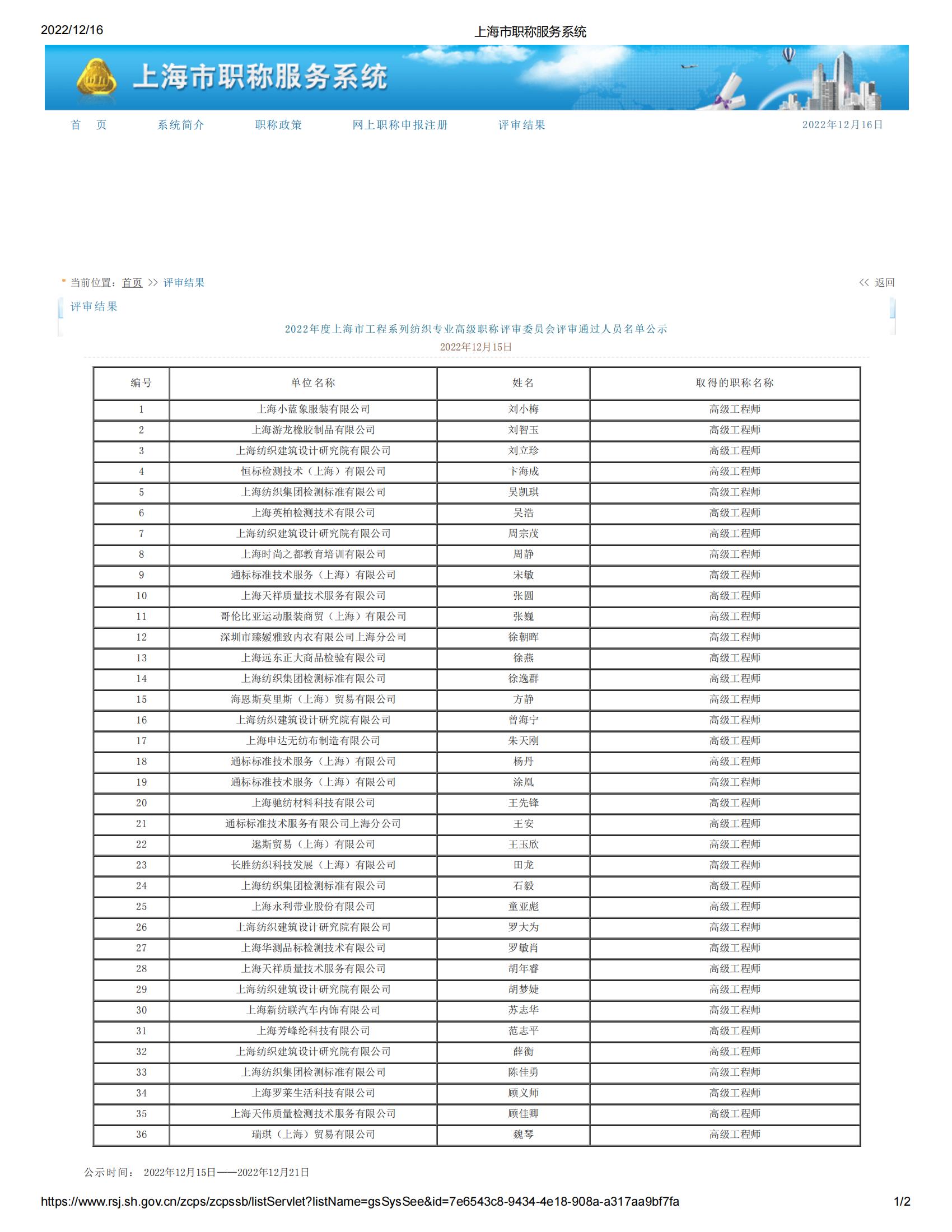 2022年度上海市工程系列紡織專業高級職稱評審委員會評審通過人員名單公示